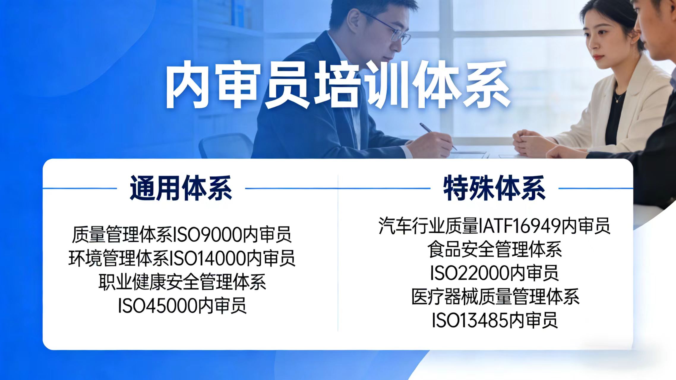 随着行业标准化发展提速,ISO体系认证已成为企业合规经营、提质增效的核心抓手,内审员更是企业体系落地、持续改进的关键人才。为满足各行业人才需求,助力个人提升职业竞争力、企业夯实管理基础,特开设ISO多体系内审员系列培训,覆盖质量、环境、职业健康安全等六大热门领域,现将详情公告如下:
